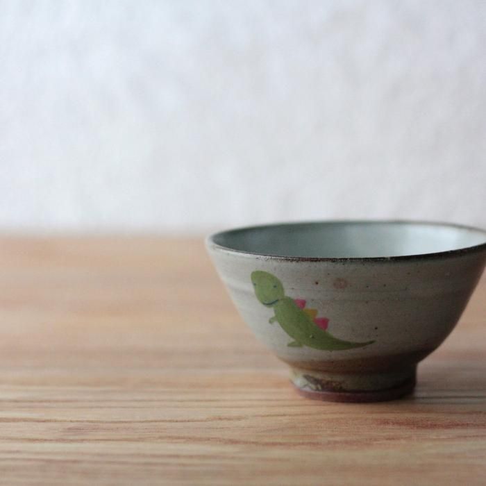 かわいいタッチで描かれた恐竜模様の飯碗。器の内側底部分には恐竜の足の跡絵が描かれていて、ご飯を全部食べたら見えてくるご褒美のよう!