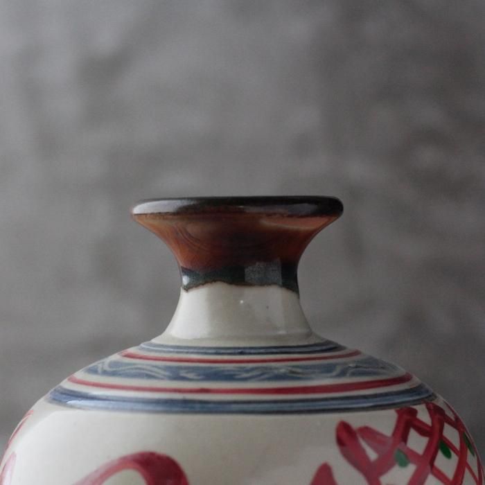 沖縄の土を使った味わいある佇まいの丸壷。壺屋焼の伝統色「赤絵」がきいていてやちむんらしさを漂わせています。