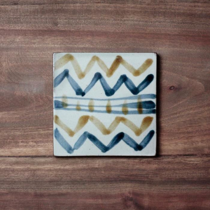 一枚一枚、手描きでていねいに描かれたやちむんの陶板。 自由なタッチで描かれた波模様が面白い一枚です。