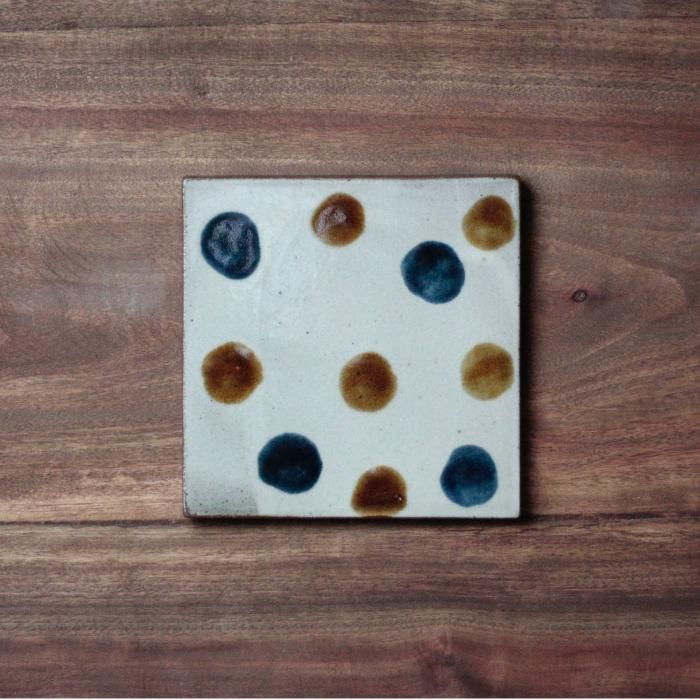 一枚一枚、手描きでていねいに描かれたやちむんの陶板。 伝統の点打ち模様で味のある一枚です。