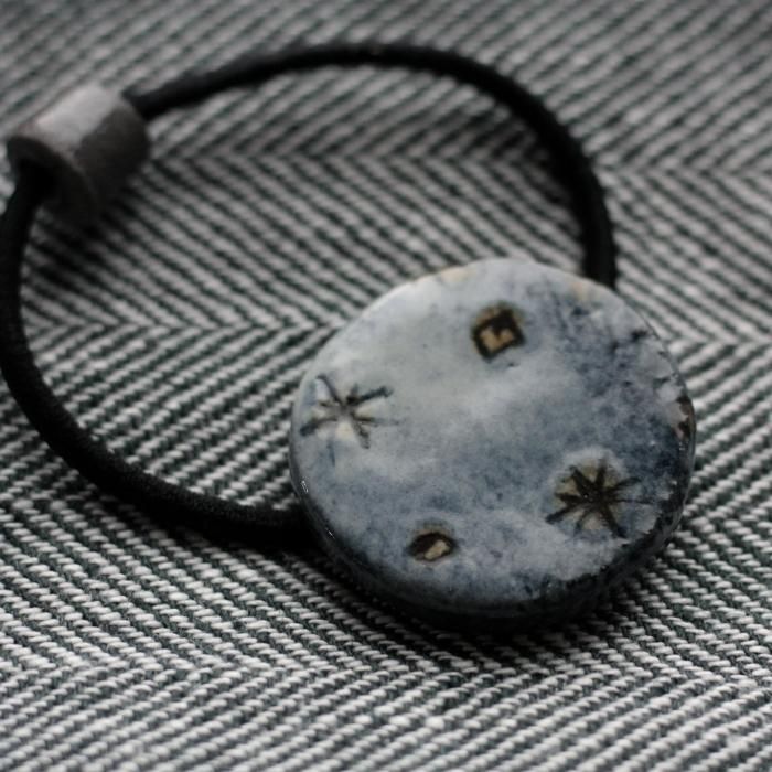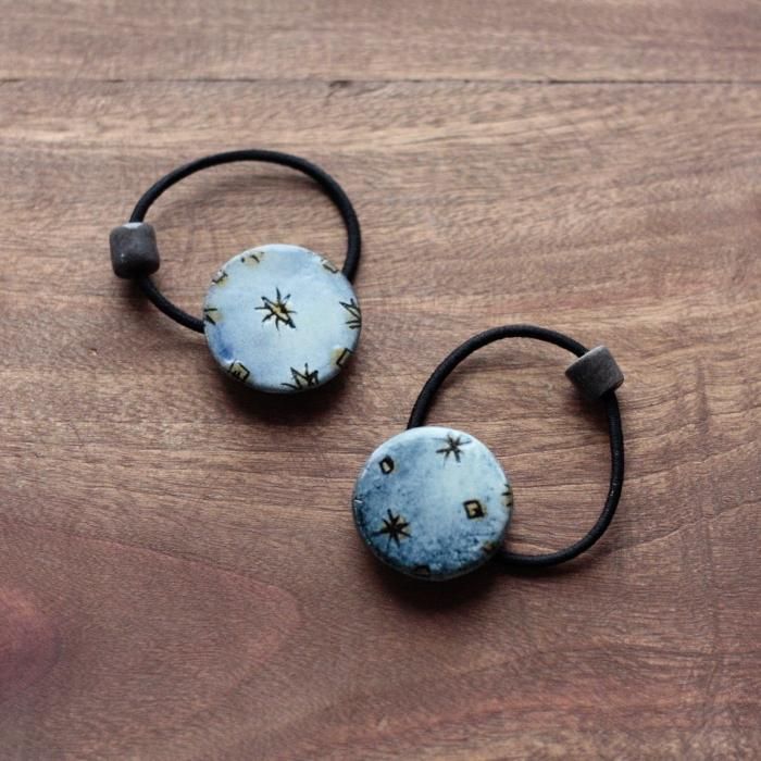 落ち着いた青の彩りの中、キュピーンッと光るような模様が面白い陶製のヘアゴム。