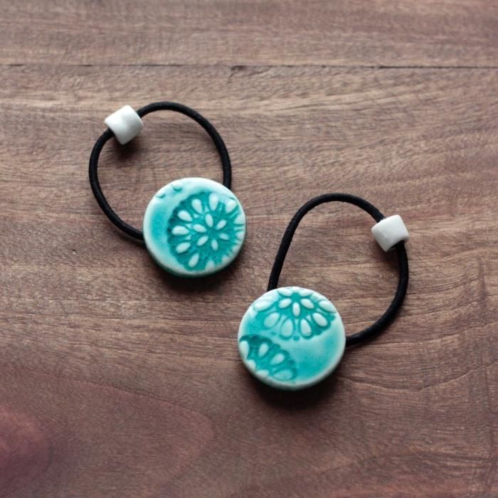 浮かび上がるようなお花模様はひとつひとつ手仕事で作られているので、少しずつ表情が違います。ゴムの色は黒色。ゴムの結び目は陶の小さな玉で隠されていて、この部分もいいアクセントになりますよ。