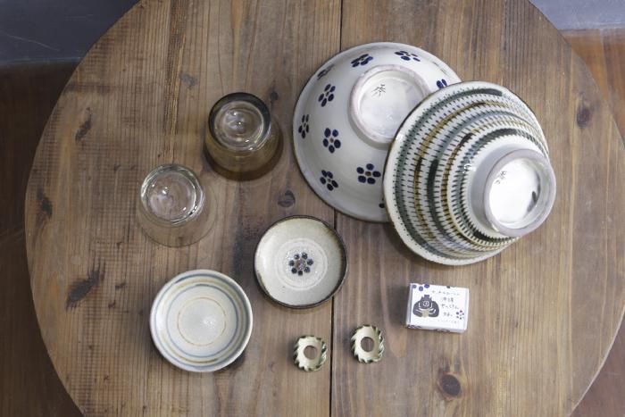 寸法 [6寸マカイ(トビカンナ) 秀工房]口径18.5cm、高さ9.5cm / [6寸マカイ(花) 秀陶房]口径18.6cm、高さ9.7cm / [ノーマルグラス(小)×2 ガラス工房清天]口径7.8cm、高さ7.1cm /  [3寸皿 北窯 松田共司工房]直径9.1cm、高さ2.3cm / [3寸皿 工房風花]直径9.2cm、高さ2.5cm / [ゴーヤはしおき×2 アトリエクッチャネ]直径3.5cm、高さ2cm / [石鹸 ヤッチとムーン] 約50g