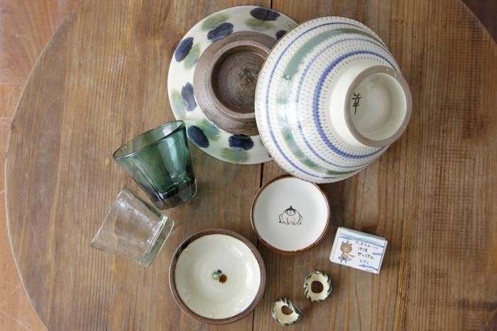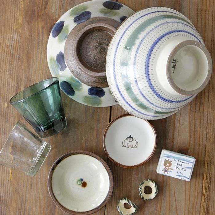 寸法 [6寸マカイ やちむん漂窯]口径18cm、高さ8.6cm / [6寸マカイ(トビカンナ グリーン) 幸陶器]口径18.3cm、高さ10cm / [日本豆皿(スモウ)ヤッチとムーン工房]直径9cm、1.8cm / [3.5寸皿 工房福田]直径11cm、高さ2.8cm / [コーングラス(小・緑) ガラス工房清天]口径9cm、高さ8cm / [ノーマルグラス(小・クリア) ガラス工房清天]口径8cm、高さ7cm / [ゴーヤはしおき×2 アトリエクッチャネ]直径3×3.5cm、高さ2cm / [石鹸 ヤッチとムーン] 約50g