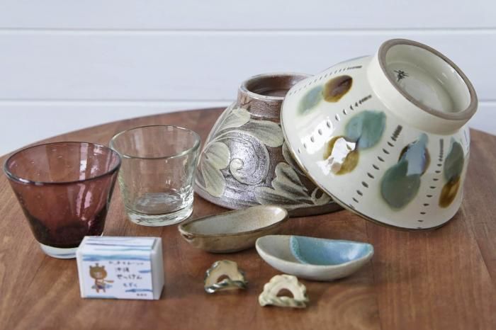 寸法 [6寸マカイ 榮一工房]口径18.6cm、高さ9.5cm / [6寸マカイ(三彩) 幸陶器]口径18.3cm、高さ9.5cm / [船型小皿 古我知焼き]直径9.2cm、高さ2cm / [コガチの豆皿 古我知焼き]直径9.7cm、高さ2.2cm / [気泡コーングラス(小・紫) ガラス工房清天]口径9.2cm、高さ7.6cm / [ノーマルグラス(小・クリア) ガラス工房清天]口径7.9cm、高さ6.9 cm / [ゴーヤはしおき×2 アトリエクッチャネ]直径3×2.5cm、高さ2cm /