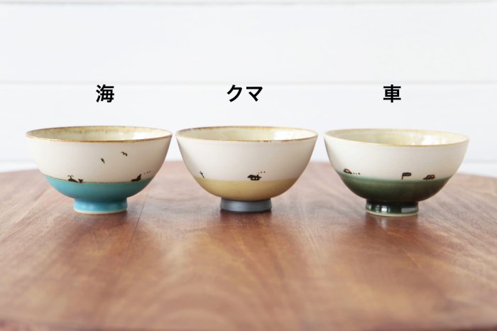 草原をのんびり走るいろんな車…。優しい緑色が印象的なお茶碗。草原の向こうをのんびりと走る車の絵が描かれています。 職人が気まぐれで描いたらくがきのような絵柄がかわいいお茶碗。まるで絵本の1ページを見るようです。