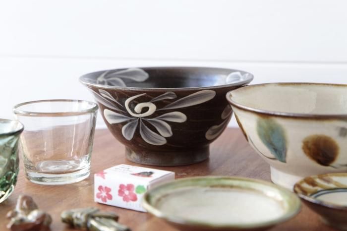 寸法 [6寸マカイ からや窯]口径17.7cm、高さ8cm / [そばマカイ(染付) 陶眞窯]口径18cm、高さ8.5cm  / [3寸皿 壺屋焼 陶眞窯] 直径9.2cm、高さ2.6cm  / [4寸皿 榮一工房] 直径11.3cm、高さ3cm  / [みなも浅グラス ガラス工房清天]口径8.2cm、高さ6.2cm / [ノーマルグラス 小 ガラス工房清天]口径7.7cm、高さ6.8cm / [はしおき  陶藝玉城]サイズ3.3cm×5.4cm、高さ1.9cm / [箸置 陶工房みちこのみ]サイズ2.4cm×6.6cm、高さ1.2cm /